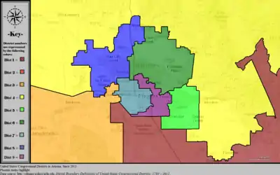 List of members of the United States House delegation from Arizona, district boundaries, and the district political ratings according to the CPVI. The delegation has a total of nine members, with six Republicans and three Democrats.