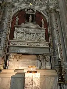 Another order from the Council dates to 1506, ordering the College of Notaries to fulfil the work.[5] Finally, in 1508, three people were appointed by the council to preside over the expansion of the chapel of Sant'Apollonio so that it could encompass the marble reliquary ark (archa marmorea et miro artificio fabricata de pecuniis collegii notariorum Brixie).[6][7] The works are thereby documented from December 1509 through November 1510, with fees for interventions such as the lowering of the floor and the remaking of the walls and the arch, the last by a master Benedictus lapicida.[8] The expenses were considerable, nearly 300 lire planette (the Brescian currency of the time).[9]