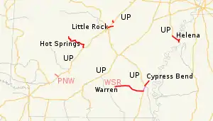 AKMD operates 138 miles (222 km) of line in Arkansas consisting of seven disconnected branch lines and two sister railroads, the Prescott & Northwestern (PNW) and the Warren & Saline River (WSR). The AKMD branches were formerly part of the Union Pacific Railroad, or a predecessor, while the PNW and WSR lines were acquired from Potlatch Corporation. All branch lines connect (interchange traffic) with Union Pacific Railroad. AKMD also interchanges with BNSF in North Little Rock, and the North Louisiana and Arkansas Railroad at McGehee.[1]