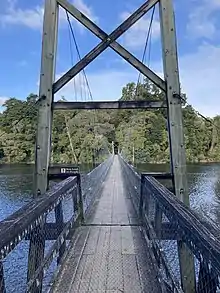 In the early days of the settlement of Moana, Noel Peat owned land in the township and across the mouth of the Arnold River, and since 1929 had petitioned the government to build a bridge at Moana connecting the two. No bridge was built, until in 1990 as part of New Zealand sesquicentennial celebrations Fletcher Challenge and the Department of Conservation collaborated on the construction of a 83-metre footbridge, which took 15 weeks to build, opening on 15 September 1990. It provided public access to the Tasman Forest Accord Scenic Reserve, 2050 ha of native forest protected from logging in 1989. The Lake Brunner Centennial Committee later developed a walking trial along the western shore of the Arnold River, now known as the Rakaitane Walk.[5]:54