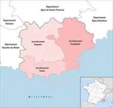 In 1800 the arrondissements of Draguignan, Brignoles, Grasse and Toulon were established.[2] The arrondissement of Grasse was passed to the new department of Alpes-Maritimes in 1860.[3] The arrondissement of Brignoles was disbanded in 1926, and restored in 1974. Toulon replaced Draguignan as prefecture in 1974.[2]