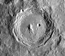 Arzachel is a Latinization of the name of the Arab astronomer and mathematician Abū Ishāq Ibrāhīm al-Zarqālī.[2] Like many of the craters on the Moon's near side, Arzachel was named by Giovanni Riccioli, whose 1651 nomenclature system has become standardized.[3] Earlier lunar cartographers had given the feature different names: Michael van Langren's 1645 map calls it "Annae, Reg. Fran.", after Anne, the Regent of France,[4] and Johannes Hevelius called it "Mons Cragus" after one of the Mount Craguses of the ancient world.[5]