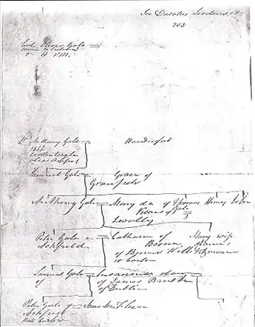 The lineage of the Ashfield Gales was documented by Sir William Betham, Ulster King-of-Arms, who created thousands of sketch pedigrees of the era using sources such as his abstracts of the prerogative wills of Ireland from 1536–1800.[1] According to Betham's pedigree, the Ashfield Gales descended from a Colonel Oliver Gale who came to Ireland during the time of Henry VIII, perhaps as part of the early English Plantations of Ireland. In support of the connection to Oliver Gale, Betham references Ducatus Leodiensis, which documents the pedigrees of many of the nobility and gentry of Yorkshire, England. According to this source, a son of Oliver Gale of Thrintoft, James Gale, resided in Ireland, "whence his Descendants during the Rebellion there transplanted themselves to Whitehaven".[2] (In this context, the "Rebellion" is the Irish Rebellion of 1641.) The Ashfield Gales and the Yorkshire Gales displayed the same Coat of arms which further supports the connection between these families.[3] This same Oliver Gale of Thrintoft pedigree is documented in Burke's Landed Gentry.[4]
