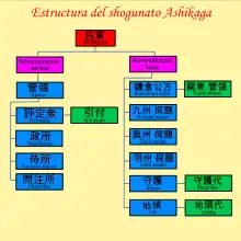The Ashikaga shogunate was established when Ashikaga Takauji was appointed Shōgun after overthrowing the Kenmu Restoration shortly after it had overthrown the Kamakura shogunate in support of Emperor Go-Daigo.[2] The Ashikaga clan governed Japan from the Imperial capital of Heian-kyō (Kyoto) as de facto military dictators along with the daimyō lords of the samurai class.[3] The Ashikaga shogunate began the Nanboku-chō period between the Pro-Ashikaga Northern Court in Kyoto and the Pro-Go-Daigo Southern Court in Yoshino until the South conceded to the North in 1392. The Ashikaga shogunate collapsed upon outbreak of the Ōnin War in 1467, entering a state of constant civil war known as the Sengoku period, and was finally dissolved when Shōgun Ashikaga Yoshiaki was overthrown by Oda Nobunaga in 1573.