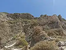 Most of the dogs were found buried in a series of terraces which had previously been occupied by a large warehouse overlooking the sea. The burial ground extended south into an area that appears to have only been briefly been used as a dog cemetery before being built upon, and probably extended west into an area that has been lost to coastal erosion. The burials have been dated to between the fifth and the first part of the fourth century BC.[3] The burial ground may have been in use for about fifty years.[5] Stager notes that as "only the eastern limits of the cemetery have been established, we can speculate that it was originally much larger, with dog burials probably numbering in the thousands." He describes it as "by far the largest dog cemetery known in the ancient world."[6] Another series of burials was found to the north-east, where dogs had been buried in streets or in thoroughfares between large buildings. These were of later dates, from the late Persian period to the early Hellenistic period.[3]