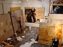 Ashley Collins is an American Contemporary Painter. Collins' massive scaled paintings are found in blue chip collections and museums worldwide.[1] Her painful and lengthy journey from homelessness and abject poverty to acclaimed painter informs meaning into each of her deeply layered works.[2] Collins is known in part for taking exhibitions to a new level, such as floating 8’x10’ works off of 50’ cranes and using fire, water and other elements as part of her exhibitions.[3] Her journey from rags to riches has been one of the most successful, in American Art, and her international recognition has soared.[4] Although painting professionally since 1988, Collins first came to blue chip collector attention in the early 2000s for her massive scaled contemporary works integrating portions of figurative horseheads amongst layers of collage, historical documents, steel, metal, and other mediums which Collins integrated into her monumental works;[5] breaking price points for living female contemporary painters.[6] “Collins has gone from being homeless and sleeping on concrete floors in pursuit of Artistic Success – and she has surely achieved it, her mega scale paintings including horse imagery [sic] command eye watering prices.”[7] Robert Rauschenberg, upon seeing her works, quoted "through her eyes and vision I have seen the pain, the confidence and sturgggle of my own journey and perhaps that is what in art touches us all".[8]