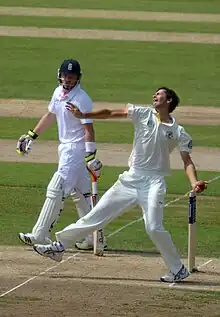 Agar was selected to tour England, Scotland, and Ireland with Australia A in June 2013.[34][35] Along with Fawad Ahmed, he was generally considered to be competing for a final position in Australia's squad for the 2013 Ashes series in England.[36] A spot in the squad for a second spinner, behind Nathan Lyon, had been kept open to be given to one of the two spinners, based on form in the lead-up to the tour.[37] Following his good form for Australia A, Agar was named to make his Test debut in the first Test of the series (played at Trent Bridge, Nottingham), replacing Lyon in the side from the previous tour.[38] Aged 19 years and 269 days, he became the twelfth-youngest Australian Test player,[39] as well as the youngest Australian since Archie Jackson (during the 1928–29 series) to make his Test debut in the Ashes.[40] On debut, he scored 98 runs from 101 balls batting eleventh in Australia's first innings, breaking several Test records, including first player to ever score a half-century as a number eleven batsman on debut, highest score by a number eleven batsman, and, with Phillip Hughes, highest partnership (163 runs) for the tenth wicket.[41][42]