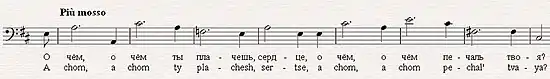 In Askold's Grave, the musical characterization of such personages as Vseslav or his fiancée Nadezhda belong to the sphere of sentiment romance. The style of chorus writing is near to Russian folk music. The role of Varangian Frelaf is comic and forestalls the character of Farlaf in Glinka’s Ruslan and Ludmila. The part of Neizvestnyi (the Unknown Man) is written for the voice (bass) of a very wide range and often a high tessitura. It contains some virtuoso passages and incredibly big intervallic leaps, like the major tenth in the second bar of the following example: