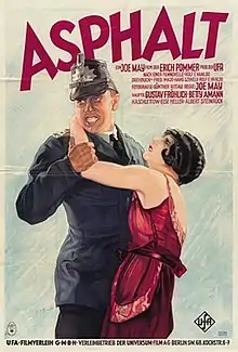 Asphalt is a 1929 German silent film directed by Joe May. The film stars Gustav Fröhlich and Betty Amann and is about a young woman in Berlin who is driven into poverty and steals a valuable piece of jewelry. She is caught by a police officer which leads to the woman to attempt to seduce him into letting her go. The film was shot between October and December 1928 at UFA.