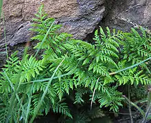 Aspidotis californica has leaves that are thin and dissected into many triangular leaflets which are subdivided into small segments with curled teeth.