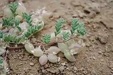 This is a very small perennial herb forming small mats or patches on the ground. The hairy stems are generally less than 3 cm (1.2 in) long. The leaves may grow to about 5 cm (2.0 in) long and are made up of several oval shaped leaflets. The inflorescence is an array of 3 to 13 small flowers, each white with purplish veins and tips.