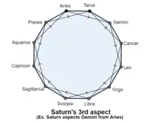 According to the Tajika System,[6] that in practice is applied more to Varshaphal (Annual Chart) or a query-chart (Horary astrology), the planetary aspect on the 5th and the 9th houses from itself is very strong, openly friendly and helpful, e.g. if the Sun is in Aries and Jupiter is in Leo both will aspect each other producing very favourable results. The aspect on the 3rd and the 11th is secretly friendly but very helpful with the former being stronger, e.g. if the Sun is in Aries and Jupiter in Gemini with both though aspecting each other the aspect of Sun will produce more favourable results than Jupiter. The aspect on the 4th and the 10th is secretly inimical, when planets forming such an aspect tend to produce bad results and cause disappointments, and on the 7th openly inimical, these aspects are unhelpful and often destructive. Tajika aspects are deemed effective within 12 degrees either side of the aspected point. This principle is followed by Western astrology. Benefic aspects cast on the 2nd and the 12th give happiness but inimical aspect on 6th, 7th and 8th and on itself cause many hardships. Aspects of partial strength are not generally taken into account.[7]