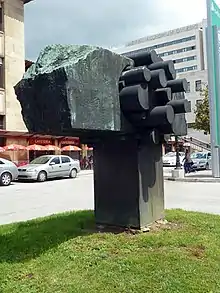 The sculpture, executed in coal and steel, is the work of José Noja, and dates from 1991.[1][2] It was commissioned from Noja by the rail company Renfe, which sought a work of art to adorn the rail station of Oviedo.[3] This large-scale work is intended as a homage to the Principality of Asturias, and so it incorporates materials such as coal that are characteristic of Asturian industry.