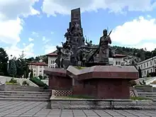Atatürk and Şerife Bacı Monument in Kastamonu depicting armed Şerife Bacı (front left) driving an ox cart and standing Mustafa Kemal Atatürk (back middle) flanked by soldiers in the Turkish War of Independence.