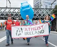 Atheist Ireland describes itself as an advocacy group for secularism, rationality, pluralism and human rights.[18] It is run by a management committee consisting of four elected officials, chairperson, Secretary, Finance Officer and Regional Officer and other co-opted volunteers. It is a voluntary, non-profit, unincorporated civil society organisation.[19] The current committee consists of Michael Nugent (chairperson), Sean O'Shea (Finance Officer), Kelvin O'Connor (Regional Officer/Membership Officer) and Helen O'Shea (Secretary).[20] Past committee members include Derek Walsh as Editor of Secular Sunday,[21] Ashling O'Brien who campaigned on repealing the 8th and spoke to the Citizen's Assembly on this issue [22] and John Hamill of thefreethoughtprophet.com.[23] Jane Donnelly has taken on the role of human rights officer focusing on the Irish education system.