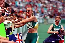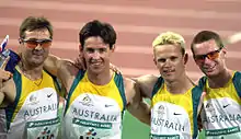 Australian track athletes (L-R) Neil Fuller, Stephen Wilson, Tim Matthews and Heath Francis after their gold medal win in the 4 x 400 m T46 relay, 2000 Summer Paralympics
