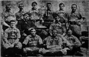 Standings at the end of the 1896 season, which had Newark finishing first, were formally protested by the Paterson team, claiming that some of Newark's games were actually exhibitions.[9] With that protest pending, the next two teams in the standings—Paterson and Hartford—arranged to play a series for the Soby Cup.[10] Paterson won the seven-game series, four games to two.[11] The protested standings were not ruled upon until the league's annual meeting in late November; despite inconsistencies in record-keeping, Newark was declared the pennant winner.[12]