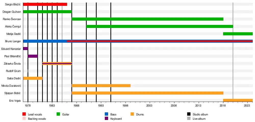 Langer became the band leader and the songwriter. In 1982 the band released the album Mentalna higijena (Mental Hygiene), recorded at the JAM Studio in London. The album featured Mel Collins on saxophone as a guest. During the same year the band went to Florida, where they recorded the album Space Generation for the foreign market. The album featured nine old Atomsko sklonište songs with English language lyrics written by Dražen Met Premet. The band released the album through EEC under the name Atomic Shelter. In 1984 the band released the album Zabranjeno snivanje (Forbidden Dreaming). The live album Jednom u životu (Once in a Lifetime), recorded on the concert held at Tašmajdan Stadium on September 15, 1984, and released in 1985, was the last album featuring Blažić on vocals. The band had the last performance with him on July 21, 1986, after which he died on January 18, 1987.