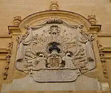 It has a symmetrical façade with an ornate Baroque centrepiece above the main entrance, containing a bronze bust of Carafa and his coat of arms, together with a marble trophy-of-arms and a Latin inscription which reads:[13][36][15]