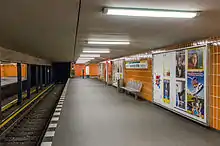 The station has 2 side platforms with exits at each end and a passenger tunnel under the tracks. The walls are tiled in dark orange or "red-brown".[2] As at Spichernstraße, there is a drop ceiling which causes a powerful draught.[1] There are only stairs at the exits, thus this station is inaccessible to people with mobility problems.