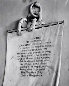 "Sacred to the Memory of Augustus Leveson Gower, Captain in His Majesty's Navy, born the 21st of June 1782. He gave early promise of being an ornament to his profession, and an honor to his country, and died much lamented, at Port Royal in this Island, on the 3rd August 1802, being then Captain of His Majesty's Ship Santa Margaretta."