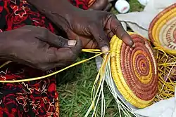 Christine Owney, a Jawoyn resident of the Manyallaluk/Eva Valley community, weaves a basket from pandanus