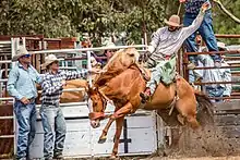 The term buck-jumping, as a regular activity involving horses, was in use in Australia by 1855.[1] Newspaper reports recorded public roughriding events that took place in Victoria during the 1880s. These events included competitions for roughriding and bullock-throwing which was accomplished by riding up to bullock, grabbing its tail and throwing it off balance and then tying its legs. This competition arose from the stockman's skill in capturing feral or wild cattle.[2]
