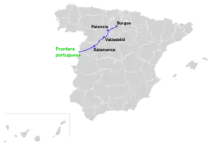 The Autovía A-62 (also known as Autovía de Castilla) is a Spanish autovía which starts in Burgos and runs through the community of Castile and León, via the cities of Palencia, Valladolid and Salamanca, before ending at the Portuguese border and the A25 autoestrada. It forms part of European route E80 and replaced the former N-620 road.[1]