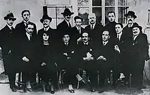 Editorial staff of Avanti! in Milan, 1921. The first sitting on the left of secretary Fasano is Guido Mazzali. The third sitting from left, with gaiters, is Pietro Nenni, and on his side, with moustaches and glasses, there is Walter Mocchi. The first above on the right is the satirical cartoonist Giuseppe Scalarini, with Giuseppe Romita sitting in front of him.