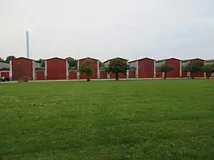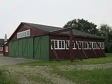 The two red painted hangars from 1917 were listed in 1976.[1] They were constructed in timber so that they could easily be burned down in the event of war. The site also features an engine testing facility from 1943. Almost a hundred metres long, it consists of a row of 10 interconnected testing halls. A vintage aircraft from 1958 has been installed on the top of a column in front of the buildings.