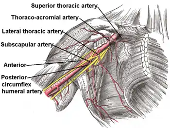 In human anatomy, the axillary artery is a large blood vessel that conveys oxygenated blood to the lateral aspect of the thorax, the axilla (armpit) and the upper limb. Its origin is at the lateral margin of the first rib, before which it is called the subclavian artery.