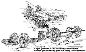 - ↑ Britain used Roman numerals to designate Marks (i.e. models) of ordnance until after World War II. Hence this article refers to the sixth, seventh and eighth models of British BL 8-inch howitzers