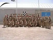 B Battery deployed to Iraq in April 2004 and was tasked with Security Sector Reform (SSR). The Battery was initially based at one of Saddam Hussein’s former Palaces in the south of Basra with Sahagun Troop tasked with mentoring the Tactical Support Unit (TSU) and being based at the Old State Building (OSB) in the centre of the city. B Battery moved location several times during the tour but spent the last two months back at the Palace providing escorts for the Provincial Support Liaison Team (PSLT). This team was part of the G5 support to assist the locals with the rebuilding of Iraq. On 28 September, whilst escorting one of these teams to a housing project in the north of Basra, the patrol was ambushed with small arms and rocket propelled grenades (RPG). The lead Snatch Land Rover was hit by a RPG which killed the driver Gunner David Lawrence and fatally wounded the commander, Corporal Marc Taylor, one of the Royal Electrical and Mechanical Engineers who was serving with the Battery as a team commander. The Battery finished the tour in late October and returned to the UK. After a period of leave, B Battery then prepared itself to deploy to Kenya to support the Royal Ghurkha Rifles (RGR), on Ex GRAND PRIX in the summer of 2005. After converting to the Light Gun, the Battery had a successful exercise. Digitisation followed in 2006 with the Regiment converting from the CLANSMAN radio system to the BOWMAN system. This required extensive re-training however proved successful following a regimental exercise. B Battery deployed to BATUS supporting 2 Royal Welsh in August 2005 and whilst there was warned off for Op TELIC 10 in 2007. On return from the exercise in Canada, the Battery put the guns into the Whole Fleet Management (WFM) programme and was selected to represent the Gunners for the Royal Regiment of Artillery Memorial Service at Hyde Park Corner.[2]