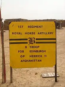 In 2007, the Battery moved into the Op TELIC 10 ORBAT and began the necessary training ready for operations in Iraq. The Battery deployed in May 2007 and was based at the Basra Air Station also known as the Contingency Operations Base (COB). Its task was to operate as an infantry company with responsibility for the Town of Az Zubayr. The Battery returned in late November after a highly successful tour. In 2008, B Battery converted to light gun and conducted numerous exercises gearing up for Op HERRICK 11 and successfully deployed to Afghanistan in October 2009. Whilst on the operation, the gun troops were separated with three guns based in FOB (Forward Operating Base) EDINBURGH and the other three were under the command of a Royal Australian Artillery troop (Brumby troop).[2]