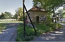 Traffic has been stopped since the fall of 2017, following the impact of construction of a 15-storey facility on the river bank by Nordic Astrum.[8] During the first building works, the street ground was displaced, resulting in a small landslide that fissured the house at 8 Babia Wieś Street, damaging the road surface, unsealing a gas pipeline and weakening the foundations of the tram track. The repair of the 130 metres (430 ft) of missing tracks, necessary for a re-opening, is not foreseen before the end of 2023.[9]