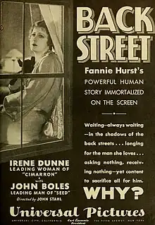 Back Street is a 1932 American pre-Code drama film directed by John M. Stahl and starring Irene Dunne and John Boles. Based on the best-selling of the same title by Fannie Hurst, it tells the story of a woman who spends her life as the secret mistress of a wealthy married man.[3] The devotion and love of the woman to the married man determines that she will be the “back streets” of him in the whole life; a story of a love that was not destined.[4] This was the first of three film versions of Hurst's novel;[5] remakes were released in 1941 and 1961.