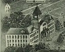 Before the Main Building at the university burned down in the great fire of 1879, it hosted a Manual Labor School (founded in 1843), that was then moved after the fire to a location near currently Walsh Hall.[5][4][3] It was the first Catholic trade school in the United States.[4] The Manual Labor School had obtained its charter in 1844, and was under the direction of the Brother of Holy Cross.[20][21] A few years later, the Manual Labor School was moved on wheels to the present location of Badin Hall.[16][22][23] The temporary structure was substituted with brick structure (the one still standing) and renamed St. Joseph Hall, in honor of St. Joseph the Worker, and hosted the St. Joseph's Industrial School' and was opened in November 1897.[24][25][5][11] It was intended to open before the start of the school year, but it did not happen because of a delay in construction.[5] The first floor contained private rooms, a reading room, and a refectory while the second floor contained classrooms, a study hall, and rooms for prefects.[26][27][28] A wide staircase led to the third floor, that was used entirely as dormitory. The first director of the new St. Joseph Hall was Rev. Gallagher, who arranged improvements to the rooms and set up a chapel where Mass was said. He provided newspapers and magazines for the boy's free moments. Once enrolled, young men ages 12 to 16 trained to be blacksmiths, bricklayers, carpenters, farmers, and tailors.[4][29][30][23][20] The goods produced were used by University personnel, and some were sold in South Bend shops.[26][31]