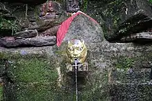 The Bagmati originates where three headwater streams converge at Bāghdwār Falls (Nepali: बाघद्वार, lit. 'Tiger Gate'), where the water flows out through a gargoyle shaped like a tiger's mouth, situated in Shivpuri Nagarjun National Park near Sundarijal in Nepal .[3][4] This lies above the southern edge of the Shivapuri Hills, about 15 kilometers (9 mi) northeast of Kathmandu. Here the Bagmati is wide and swift with a high load of suspended solids, giving it a grey appearance.[4] The river flows southwest about 10 km (6 mi) through terraced rice fields in the Kathmandu Valley.[4]
