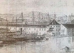 In the beginning, able-bodied prisoners lived in the casements of the ramparts or on prison ships. In 1814 they were transferred to a building on shore, 115 meters long, which was perpendicular to the hospital, located on the southwest quay, between the Darse Vauban and the entrance to the old port.[5] Even after the construction of the new building, some prisoners continued to be held on ships when there was no place on land.[2]