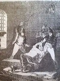 One mass escape attempt was made on the night of June 21–22, 1824, during very stormy weather. Fifteen prisoners, led by one prisoner who was a stonemason, made a hole in the wall of their dormitory, put dummies in their beds, escaped through the neighboring gunpowder storeroom, and made their way to the quay. One was wounded by a gunshot, two drowned in the harbor from the weight of their chains, but the other twelve escaped into the city and the countryside. However, within eight days, the remaining twelve escapees were all recaptured.[17]