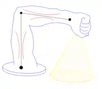 This lamp works by coupling together the upper arm and the forearm. It is called a gravity-locked or cam-locked elbow.[1]