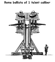One talent ballista (26 kg [57 lb] weight projectile) was typical for Roman era ballista. The heaviest version ever made was built by Archimedes, and used stones up to three talents (78 kg [172 lb]).[7]