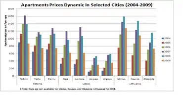 • Overheating property market: In Estonia, a property price bubble was largely concentrated in Tallinn, Tartu City and Pärnu City. The average price of apartments purchased in Estonia excluding Tallinn in 2004 was estimated at EEK10,045 (642) per square metre but increased to EEK18,134(€1,159) per square metre in 2007.[2] In Tallinn, from an average of EEK14,035(€897) per square metre in 2004, the average price reached EEK25,447(€1,620) per square metre in 2007.[2] Elsewhere in Tartu City, the average price per square metre touched as high as EEK18,290 (€1,169) in 2007 compared to EEK10,123 (€647) per square metre in 2004.[2] Meanwhile, in Pärnu City, the average price of apartments purchased in 2007 was estimated at EEK20,027 (€1,280) per square metre compared to EEK11,093 (€709) per square metre in 2004.[2] In Latvia, a property price bubble could be detected in Riga, Jūrmala, Liepāja and Jelgava. The average price for urban localities on average per metre square was LVL158 (€224) in 2004 but went up to LVL665 (€946) in 2007.[3] Riga experienced the highest incremental in term of apartment price per metre square – from LVL229 (€325) (in 2004) to LVL841 (€1,196) (in 2007), a jump of 267%.[3] Jurmala of Pierīga region recorded a huge jump, in terms of price per square metre; from LVL 222 (€315) (in 2004) to LVL916 (€1,303) (in 2007).[3] Other cities also recorded a similar pattern: Liepāja (Kurzeme) from LVL79 (€112) per metre square in 2004 to LVL 338 (€480) per metre square in 2007, Jelgava (Zemgale) from LVL96 (€136) per square metre in 2004 to LVL 396 (€563).[3] In Lithuania, the property bubble could be seen in Vilnius, Kaunas and Klaipėda. In Vilnius, the average price per square metre in 2005 reached LTL2,618 (758) but hit as high as LTL 5,500 (€1,592) in 2008.[4] In Kaunas, the average price per metre in 2008 reached LTL5,083 (€1,472) compared to LTL1,916 (€554) in 2005.[4] In Klaipeda, the average per metre in 2005 was about LTL1,416 (€410) but went up to LTL4,000(€1,158).[4]