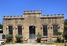 Bandera County was organized in 1856 and used makeshift quarters for jail and courthouse functions until 1877, when the county purchased a two-story stone building constructed in 1868 which is now known as the Old Courthouse. The building served as county courthouse until the present courthouse was built in 1891.[2][3] A former one-story cut stone jail adjacent to the Old Courthouse designed by San Antonio architect Alfred Giles was built in 1881.[4] On October 31, 1979, the two buildings, located on 12th St. between Maple St. and SH 16, were added to the National Register of Historic Places as a single entry.[5] The two buildings are also jointly listed as a State Antiquities Landmark.[6]