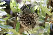 Banksias are heavy producers of nectar, making them an important source of food for nectivorous animals, including honeyeaters and small mammals such as rodents, antechinus, honey possums, pygmy possums, gliders and bats.[24] Many of these animals play a role in pollination of Banksia. Various studies have shown mammals and birds to be important pollinators.[25][26] In 1978 Carpenter[27] observed that some banksias had a stronger odour at night, possibly to attract nocturnal mammal pollinators. Other associated fauna include the larvae of moths (such as the Dryandra Moth) and weevils, which burrow into the "cones" to eat the seeds and pupate in the follicles; and birds such as cockatoos, who break off the "cones" to eat both the seeds and the insect larvae.