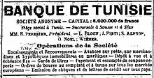 The Banque de Tunisie was created on 23 September 1884 by the Banque Transatlantique which converted its existing Tunis office into a fully-fledged local bank, three years after the establishment of the French protectorate of Tunisia. Its seat was a diminutive building at 3, rue Es-Sadikia (now rue Gamal Abdel Nasser), across the street from the French protectorate residence,[4] which has since been demolished. Its founders hoped to secure the exclusive right to issue banknotes in the protectorate from the French government,[1]:130 which however was eventually granted to the Banque de l'Algérie in 1904.