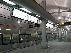 Bao'an Highway (simplified Chinese: 宝安公路; traditional Chinese: 寶安公路; pinyin: Bǎo'ān Gōnglù) is a station on Shanghai Metro Line 1.[1] This station is part of the northern extension of that line from Gongfu Xincun to Fujin Road that opened on 29 December 2007.[2]
