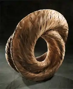 Arts critic Kathryn Hixson described works such as the vertical, six-foot Voluta (1988) as amassing seemingly random, curvilinear layerings "to form strong unified objects, almost mathematical in their purity and stability," which hover on walls "like protective presences."[14] Susan Snodgrass and Fred Camper wrote that works, such as the coiled, vortex-like Cyclus, cocoon-like Plexus or undulating, pod-like Ova (all 1994), simultaneously allude to anthropomorphic figures, ancient fertility statues and scientific proofs, blurring boundaries between the natural and cultural, romantic and rational.[10][35][36][37]