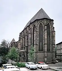 The Barfüßerkirche (pronounced [ˈbaːʁfyːsɐˌkɪʁçə], "Discalced's Church") in the historical city centre of Erfurt in Thuringia, Germany, belonged to the most important church buildings of the city and was one of the most elaborate mendicant churches in Germany until its extensive destruction by bombing in 1944. It was mainly built in the 14th century as a monastery church of the Franciscans, who were also called Barfüßer (the Discalced, meaning "the Barefoot"). The choir was restored in the 1950s; besides the nave's ruin, it is situated west of the Schlösserbrücke bridge on the right bank of the Breitstrom, a branch of the Gera river.