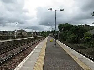 ![]() View from Platforms 2 and 3 at Barrhead railway station, looking towards Kilmarnock | |